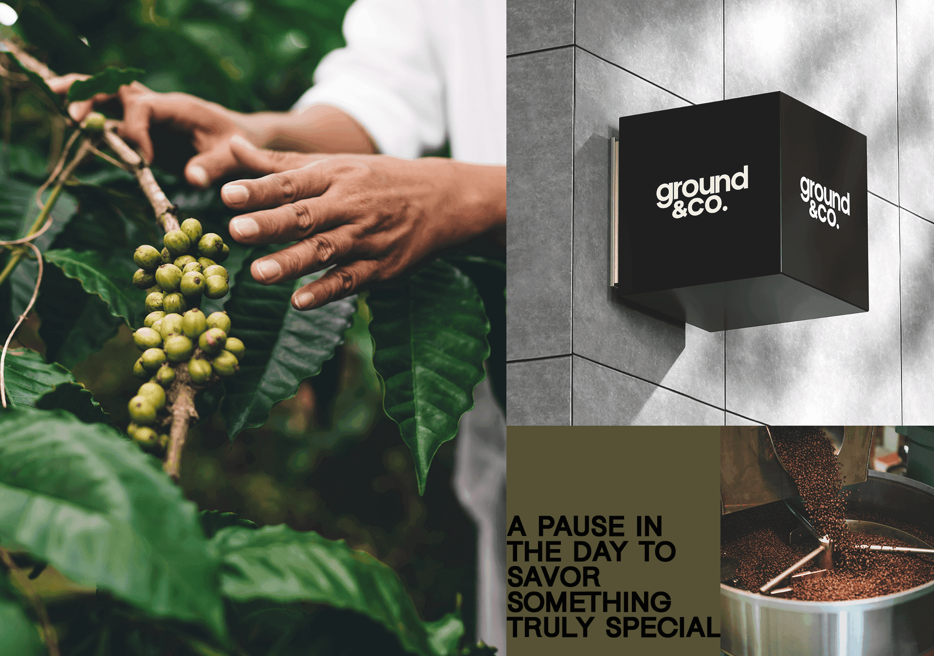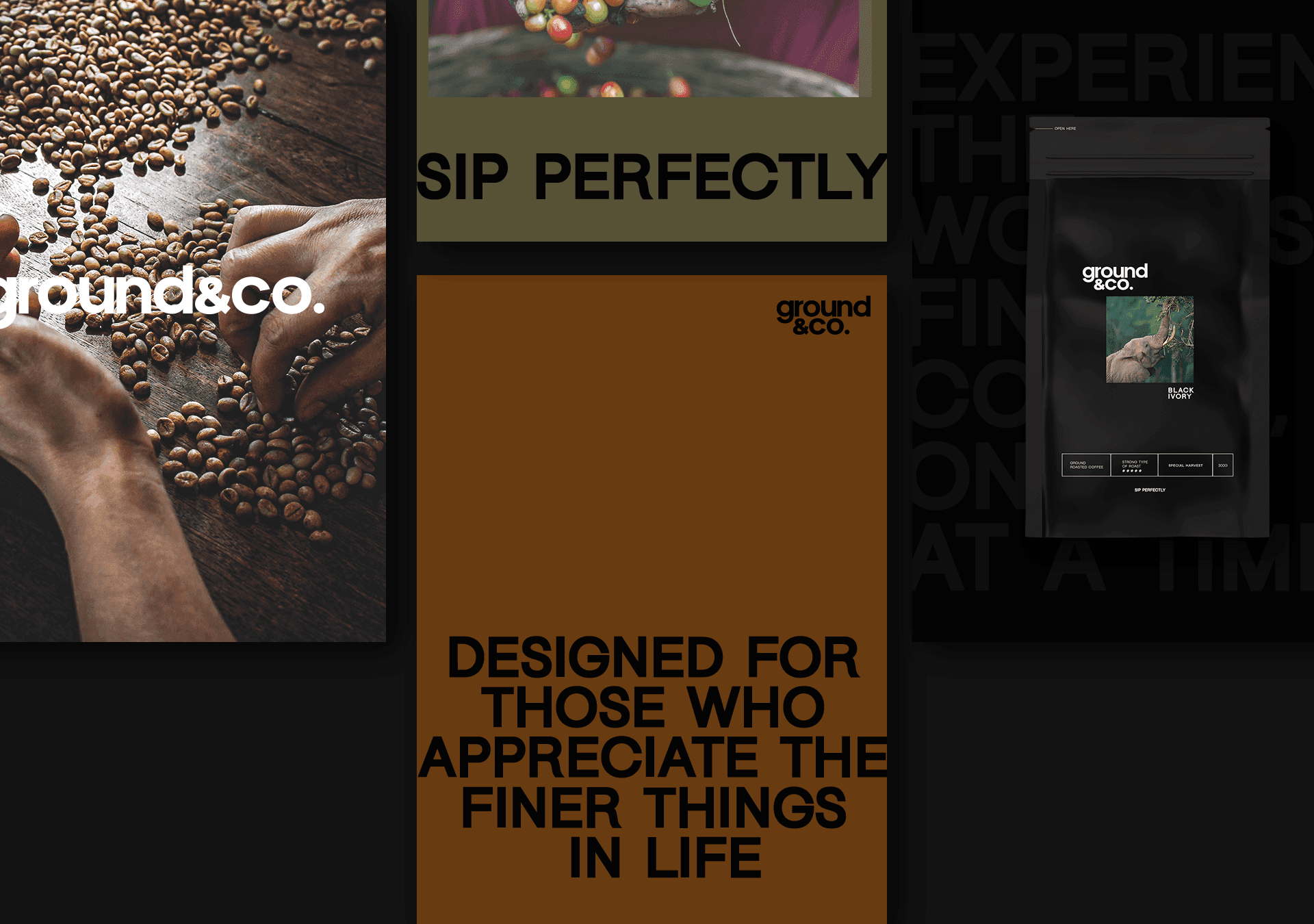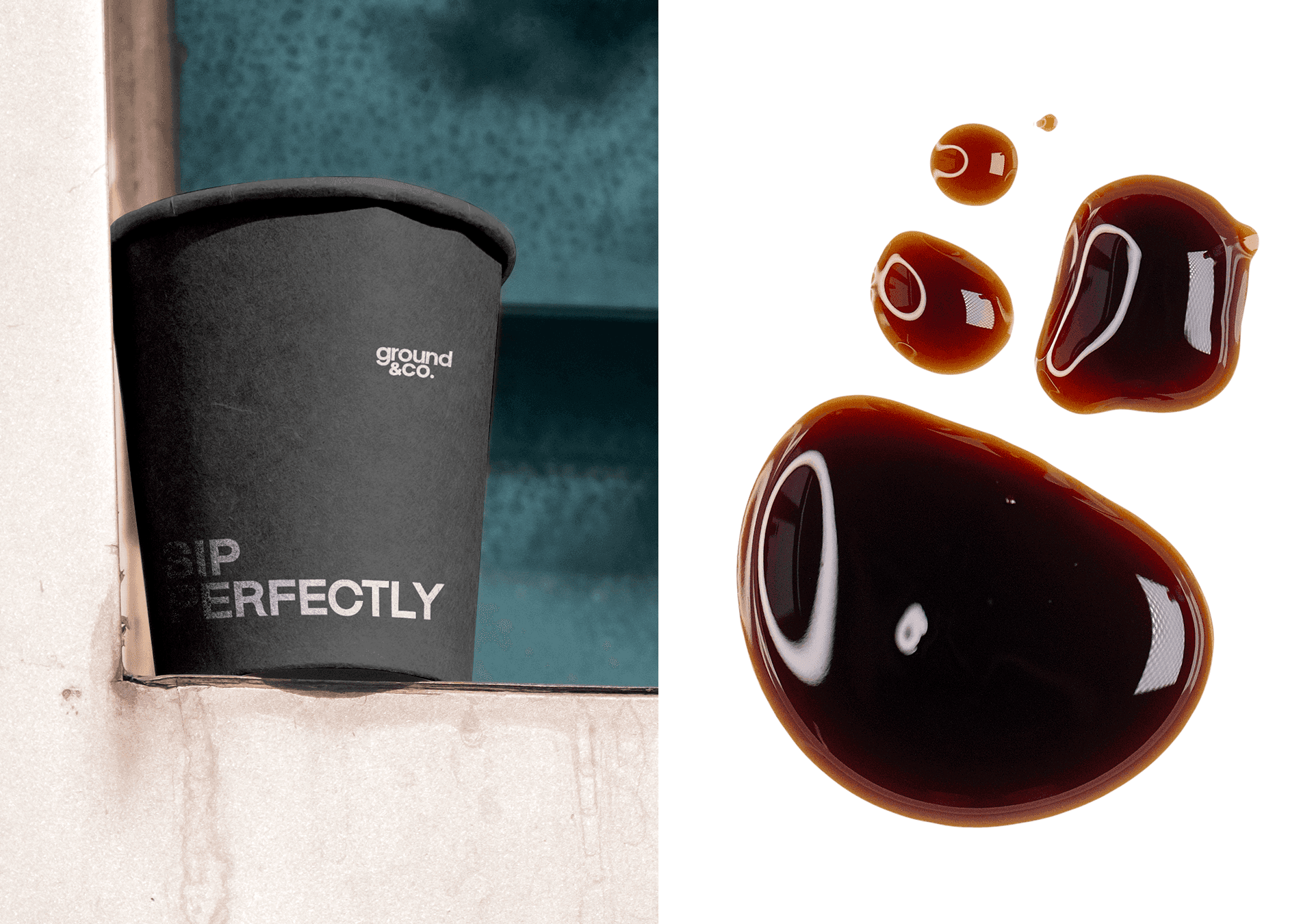 El lenguaje visual de Ground&Co. vive en los detalles: en el packaging sobrio, en las frases que acompañan cada pieza (“Sip perfectly”, “Uncompromising quality in every cup”), en los materiales que invitan a tocar, mirar, oler. Cada aplicación fue pensada como una extensión del momento en que el consumidor se sirve su taza y se permite respirar.