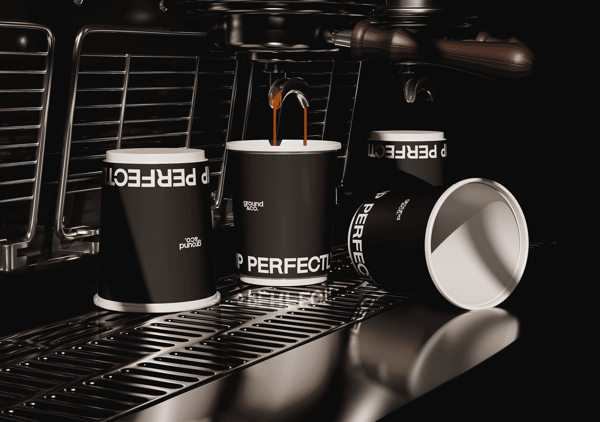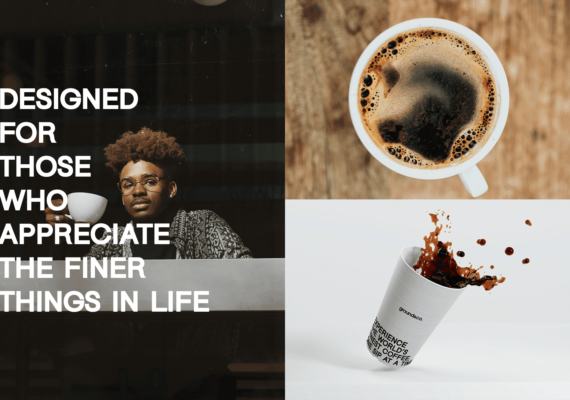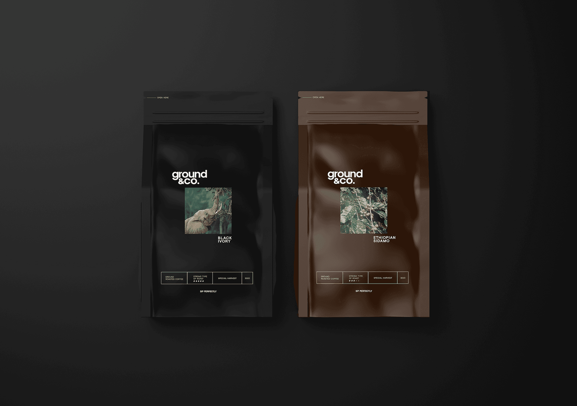 El lenguaje visual de Ground&Co. vive en los detalles: en el packaging sobrio, en las frases que acompañan cada pieza (“Sip perfectly”, “Uncompromising quality in every cup”), en los materiales que invitan a tocar, mirar, oler. Cada aplicación fue pensada como una extensión del momento en que el consumidor se sirve su taza y se permite respirar.